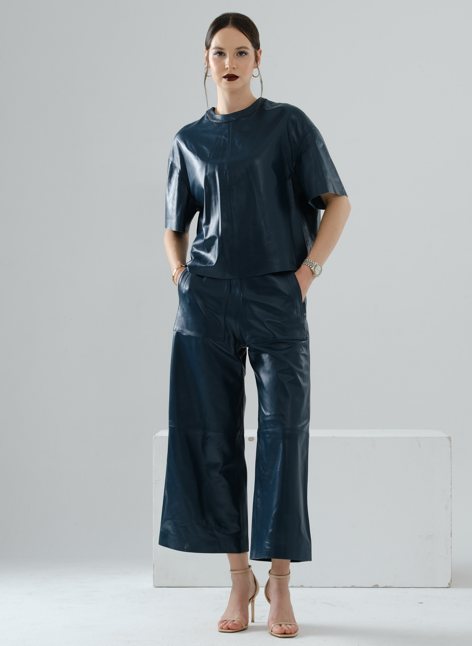 Loose-Fit Large Pocket Short Leather Pants – Petrol