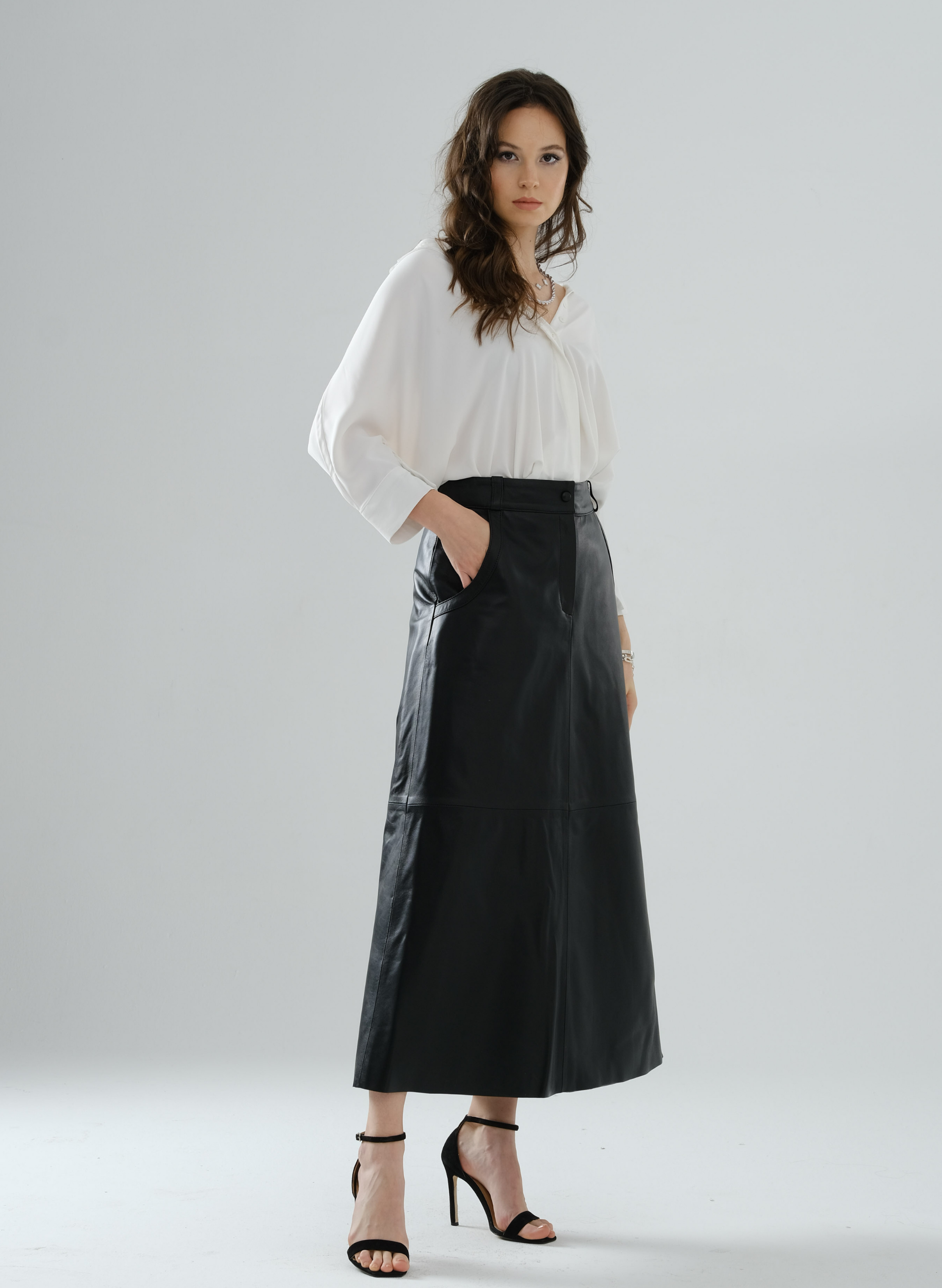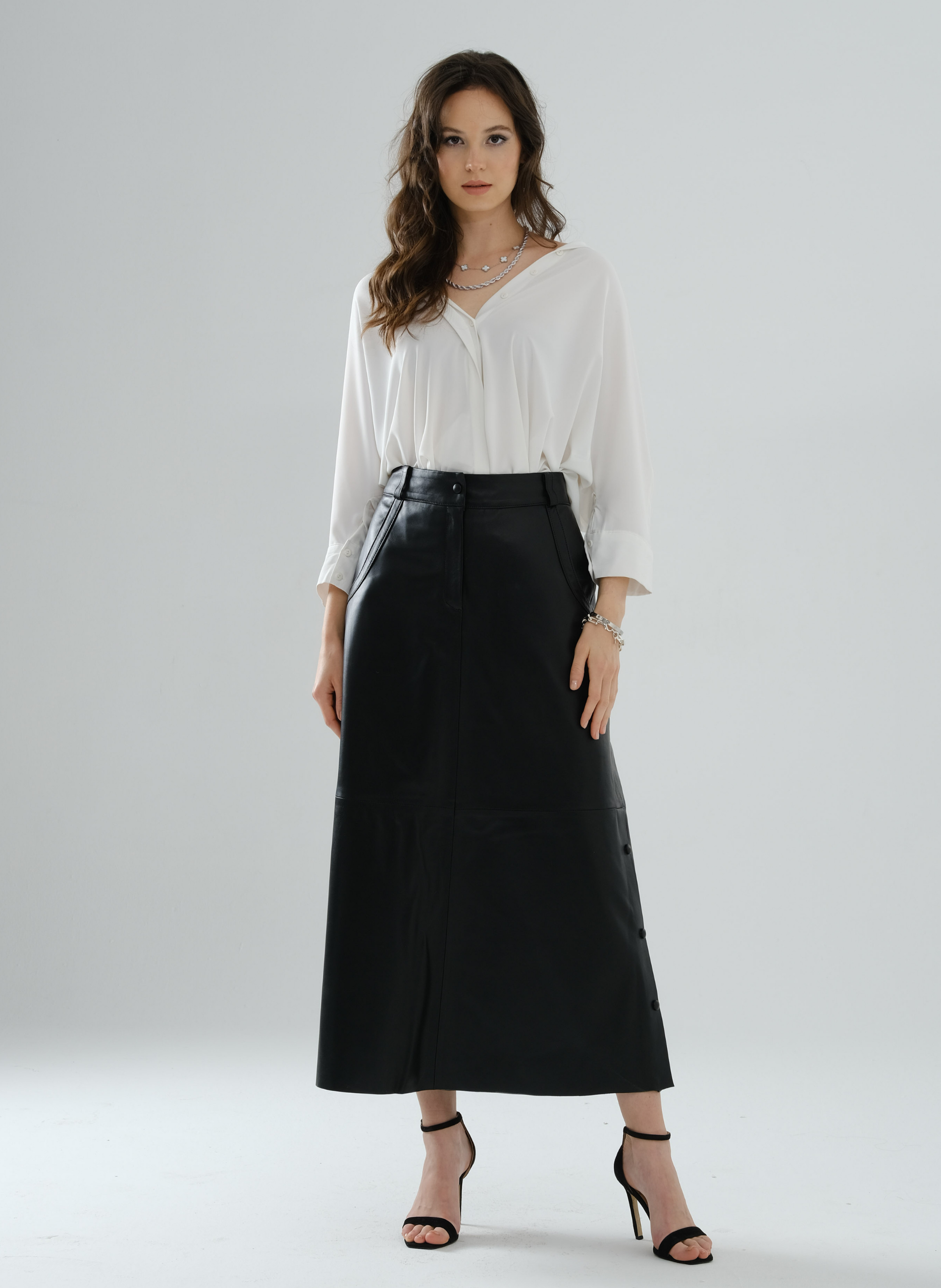 Side-Snap Long Leather Skirt – Black
